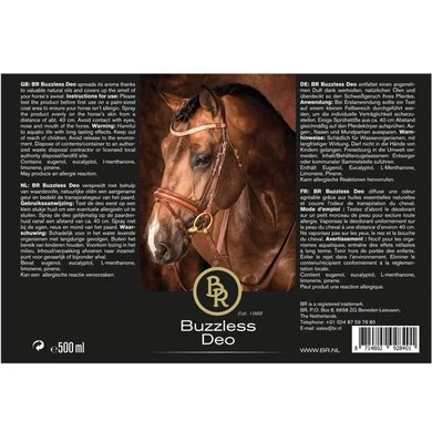 De BR Buzzless Deo verspreidt met behulp van waardevolle, natuurlijke oliën een aangename geur en bedekt de transpiratiegeur van het paard. Inhoud: 500 ml.