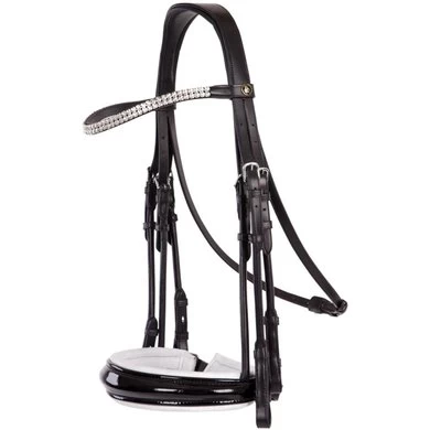 Dit symmetrische hoofdstel van hoogwaardig Europees leder heeft een E-Line kopstuk. Dit anatomisch gevormde kopstuk is zacht gevoerd en zorgt dankzij de ronde vorm voor extra vrijheid achter de oren van het paard. Het gebogen frondeel is voorzien van twee rijen grote kristallen van Swarovski®en onderlegd met zacht leder. De keelriem is verstelbaar met één gespsluiting aan de onderzijde. De gespsluiting is voorzien van een extra beschermflap. De bakstukken zijn vervaardigd van rondgenaaid leder en voorzien van blinde sluitingen. Het hoofdstel heeft een brede aansnoerneusriem (circa 5 cm) met lakleder en rondgenaaide riempjes. De neusriem is rond gebombeerd, zacht gevoerd en voorzien van een brede, zacht gevoerde kaakbeschermer. De neusriem is bovendien anatomisch gevormd. Het hoofdstel is voorzien van blinde sluitingen en ronde, glanzende, zilverkleurige fournituren. Exclusief teugels.