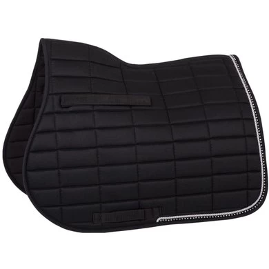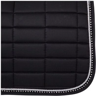 Chique, voorgevormd zadeldek van polyester katoen met een polyester Airflow voering. Het zadeldek heeft een vulling van 300 g polyfill en 10 mm foam. De buitenstof heeft een rechthoekige stepping van 10 x 5 cm. Het zadeldek is luxe afgewerkt met een zilverkleurige koordbies en een bies met imitatie diamanten. De singel- en zadellussen zijn voorzien van klittenband.