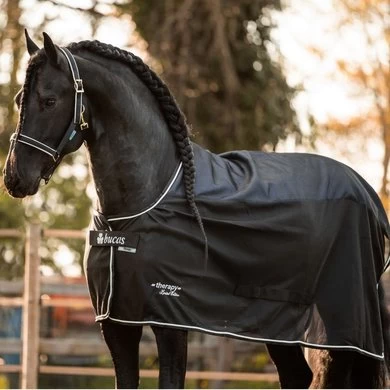 De Therapy Mesh Cooler-deken is ideaal voor gebruik tijdens de warmere maanden lente/zomer/herfst. Het heeft dezelfde voordelen als de Bucas Therapy Cooler, maar met een lichtgewicht gaas aan de onderkant om de lucht rond het lichaam van het paard te laten circuleren tijdens warme/vochtige dagen.