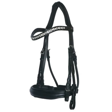 Stang en trens hoofdstel, brede onderlegde aansnoerneusriem met bituitsparing, breed anatomisch kopstuk, wave frontriem met crystal stenen.