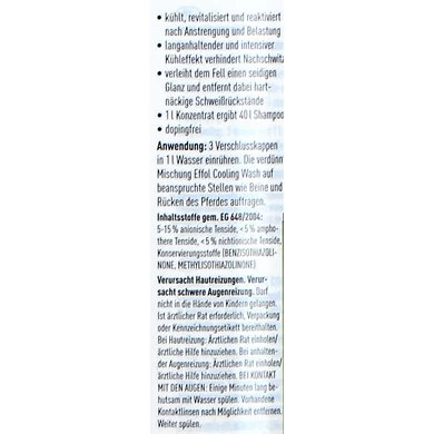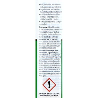 Deze Effol med Cooling-Wash is een effectieve verkoelende shampoo die de spieren helpt verfrissen na intensief of vermoeiend werk. De shampoo revitaliseert en koel effectief gedurende een langere periode. De ingrediënten maken de vacht schoon en glanzend zonder deze uit te drogen.