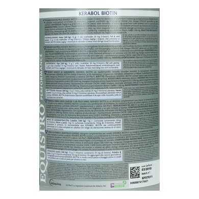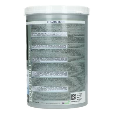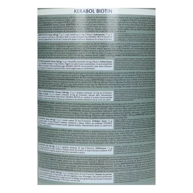 Ondersteunt de vorming van gezonde hoeven en van gezond haar. Aanvullend diervoeder voor paarden met hoogwaardig biotine, zink, selenium en DL-methionine voor een verbeterde kwaliteit van hoeven,vacht en huid. Gebruik: Ondersteunt de vorming van gezonde hoeven en van gezond haar. 1 kg bevat: DL-methionine 334 900 mg, zink 6 650 mg, mangaan 2 000 mg, selenium 16 mg, biotine 1 300 mg. Voldoende voor (paard 500 kg): 1 000 g: tot 67 dagen