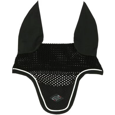 Oornetje van 100% gehaakt polyester om uw paard tegen vliegen te beschermen, met logo-insert en elastische Lycra-stof oren. Versierd met een dun koord. Past perfect bij de sjabrakken, peesbeschermers en strijklappen, halsters, polobandages en gesloten peesbeschermers van de French Touch collectie.