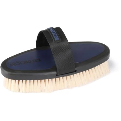 De lichaamsborstel van geitenhaar heeft een zachte handgreep, webhandriem en superzachte borstelharen voor een schitterende glans. Onderdeel van het EZI-GROOM Grip-assortiment. Afmetingen: 200 mm lang, 25 mm borstelharen.
