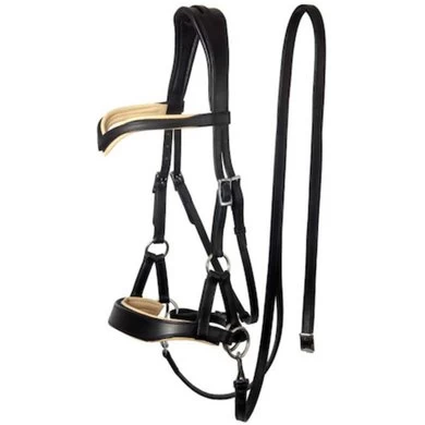 Met een V-shape frontriem, nekstuk anatomisch gevormd, neusriem breed aflopend, high density foam in de nek, neus en frontpadding welke verwisselbaar is van kleur, inclusief 18 mm softleder teugels met clips