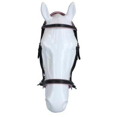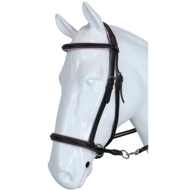 F.R.A. bitloos systeem 5: bitloze optomingen zijn niet nieuw! Eeuwenlang werd een bitloze optoming als vanzelfsprekend ervaren, voordat er ooit aan werd gedacht iets in de mond van het paard te stoppen legde de mens er simpelweg iets omheen. Een touw als halster was destijds voldoende en zo ontstond de eerste bitloze optoming. In combinatie met de ondersteunende gewichts-,been- en gevoelshulpen onderhoudt de ruiterhand via de teugels kontakt, niet met de mond, maar met het hoofd van het paard. Werkingsprincipe: druk op neus, nek èn wangen, nek/kingekruiste teugelvoering. Bouw: De lederen neusriem van deze optomingen, in de markt veelal bekend onder systeem Cook, is aan beide zijden even achter de bakstukken voorzien van een ring. Door deze ringen loopt een soepele lederen riem kruislings over de kin, via de kaken over de nek. Aan beide uiteinden van deze riem worden de gespen of clips van de teugeluiteinden bevestigd. Aan de linkerzijde van het hoofdstel vind je één gesp voor de bakstukafstelling en één gesp voor het verbinden van de kruislingse riemen. Ter bescherming van het nekgebied zijn beide riemen daar met een zachte padding onderlegd. De riemen dienen zodanig door de passanten van deze nekpadding verschoven te worden dat ze aan beide zijden gelijke lengte hebben. De gesp van de kinriem is de enige gesp die nodig is om het hooofdstel op het hoofd te fixeren. Ligging: Evenals bij de meeste bitloze optomingen geldt ook voor deze optomingen dat de neusriem op het harde gedeelte van de neus moet liggen, ongeveer daar waar het neusbeen begint. De kinriem mag gevoelsmatig ’te’ vast, maar beslist niet aangesnoerd zijn. Dit om verdraaiïng van het hoofdstel te voorkomen. De bakstukken van bitloze hoofdstellen met een kin- nekgekruist systeem zullen altijd de neiging hebben enigszins op te bollen. Inwerking: