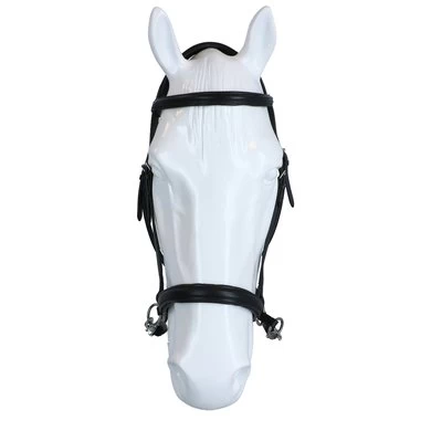 F.R.A. bitloos systeem 5: bitloze optomingen zijn niet nieuw! Eeuwenlang werd een bitloze optoming als vanzelfsprekend ervaren, voordat er ooit aan werd gedacht iets in de mond van het paard te stoppen legde de mens er simpelweg iets omheen. Een touw als halster was destijds voldoende en zo ontstond de eerste bitloze optoming. In combinatie met de ondersteunende gewichts-,been- en gevoelshulpen onderhoudt de ruiterhand via de teugels kontakt, niet met de mond, maar met het hoofd van het paard. Werkingsprincipe: druk op neus, nek èn wangen, nek/kingekruiste teugelvoering. Bouw: De lederen neusriem van deze optomingen, in de markt veelal bekend onder systeem Cook, is aan beide zijden even achter de bakstukken voorzien van een ring. Door deze ringen loopt een soepele lederen riem kruislings over de kin, via de kaken over de nek. Aan beide uiteinden van deze riem worden de gespen of clips van de teugeluiteinden bevestigd. Aan de linkerzijde van het hoofdstel vind je één gesp voor de bakstukafstelling en één gesp voor het verbinden van de kruislingse riemen. Ter bescherming van het nekgebied zijn beide riemen daar met een zachte padding onderlegd. De riemen dienen zodanig door de passanten van deze nekpadding verschoven te worden dat ze aan beide zijden gelijke lengte hebben. De gesp van de kinriem is de enige gesp die nodig is om het hooofdstel op het hoofd te fixeren. Ligging: Evenals bij de meeste bitloze optomingen geldt ook voor deze optomingen dat de neusriem op het harde gedeelte van de neus moet liggen, ongeveer daar waar het neusbeen begint. De kinriem mag gevoelsmatig ’te’ vast, maar beslist niet aangesnoerd zijn. Dit om verdraaiïng van het hoofdstel te voorkomen. De bakstukken van bitloze hoofdstellen met een kin- nekgekruist systeem zullen altijd de neiging hebben enigszins op te bollen. Inwerking: