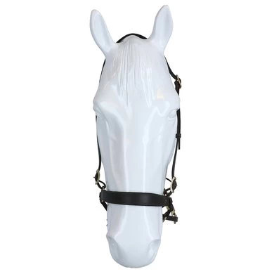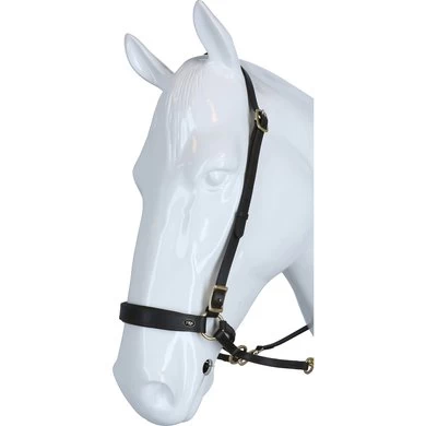 F.R.A. bitloos systeem 4: bitloze optomingen zijn niet nieuw! Eeuwenlang werd een bitloze optoming als vanzelfsprekend ervaren, voordat er ooit aan werd gedacht iets in de mond van het paard te stoppen legde de mens er simpelweg iets omheen. Een touw als halster was destijds voldoende en zo ontstond de eerste bitloze optoming. In combinatie met de ondersteunende gewichts-,been- en gevoelshulpen onderhoudt de ruiterhand via de teugels kontakt, niet met de mond, maar met het hoofd van het paard. Werkingsprincipe: druk op neus en wangen, kingekruiste teugelvoering. Bouw: In dit systeem eindigt de neusriem aan beide zijden met een ring waaraan de bakstukken en de beide kinkruisriemen zijn bevestigd. Deze riemen vinden hun kruisgeleiding door een ring aan het einde van een kort stukje leder dat op zich dan weer aan de ringen van de neusriem is bevestigd. Gevolg is dat het kruislingse geheel wat lager hangt dan bij kaakgekruiste optomingen (zie systeem 5). Aan de uiteinden van de kruisriemen worden de teugels bevestigd. Verder is dit hoofdstel eenvoudig in uitvoering door het ontbreken van een frontriem, een keelriem en de stoot en gesp die we normaal op een neusriem aantreffen. Aan de linkerzijde vind je een gespverbinding in het bakstuk, het is de enige gesp, die nodig is om het hoofdstel op maat te maken. Éénmaal op maat, dan schuif je het hoofdstel van dit systeem simpelweg op het paardenhoofd waarna je niets meer hoeft vast te maken. Voor de serie F.R.A.® katoenen hoofdstelen uit systeem 4 geldt in essentie het hier beschrevene, uiteraard is er in die lijn van hoofdstellen geen sprake van gespverbindingen of andere op leder betrekking hebbende omschrijvingen. Ligging: Evenals bij de meeste bitloze optomingen geldt ook voor de hoofdstellen uit systeem 4, dat de neusriem op het harde gedeelte van de neus moet liggen, ongeveer daar waar het neusbeen begint. De bijzondere bouw van deze hoofdstellen zorgen voor een goede en vaste ligging op het paardenhoofd zonder dat je iets behoeft vast te maken. Inwerking: De kingekruiste riemen zorgen ervoor dat wanneer je links of rechts vraagt, het paard druk aan de andere kant op neus en wang krijgt en vervolgens de hand van de ruiter volgt: wendingen dus als gevolg van druk. Gelijktijdige ophoudingen aan beide teugels sluiten de neusriem en geven mogelijkheden tot halthouden of tempowisselingen. Het genoemde vragen van linker, rechter of beide teugels zal door de indirecte teugelvoering altijd een bepaalde mate van dosering in zich hebben, het is deze dosering die de mate van discriminerende inwerking bepaald. Dit heeft tot gevolg dat een gewenste wijziging in de mate van discriminatie altijd in een vloeiend effect tot stand zal komen. Vanzelfsprekend worden teugelhulpen ondersteund met overige ondersteunende hulpen. Het verbindigsriempje dat de teugelgeleidering aan de neusriem en het bakstuk verbindt zorgt voor een lage ligging en vrije doorvoer van de kruislingse kinkruisriemen hetgeen de release zeer ten goede komt. Extra aandacht bij dit type hoofdstellen zal altijd moeten worden gegeven aan het onderhoud van de gekruiste kinriemen, het juiste onderhoud zal het leder de soepelheid geven om in de ringen de juiste release blijvend te kunnen ondervinden. Het hoofdstel leent zich niet tot longeren met de enkele longe en daardoor dus ook niet tot pessoa longeren. Voor het longeren aan de dubbele lijnen neemt u de teugels af en gebruikt u de vrijkomende ringen voor het bevestigen van de lange lijnen. Geschiktheid: De optoming wordt in combinatie met licht teugelcontact gebruikt en is zeer geschikt voor gevoelige paarden. Daardoor leent de optoming zich ook in het bijzonder voor in te rijden jonge paarden en hoog in het bloed staande gevoelige dieren, in die categorie is het hoofdstel ook als menhoofdstel te gebruiken. Naast dat het hoofdstel als leidhalster te gebruiken is geeft het tevens volledige mondvrijheid hetgeen op buitenritten zijn voordeel kan bieden.