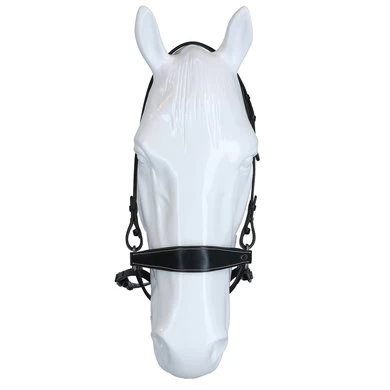 F.R.A. bitloos systeem 4: bitloze optomingen zijn niet nieuw! Eeuwenlang werd een bitloze optoming als vanzelfsprekend ervaren, voordat er ooit aan werd gedacht iets in de mond van het paard te stoppen legde de mens er simpelweg iets omheen. Een touw als halster was destijds voldoende en zo ontstond de eerste bitloze optoming. In combinatie met de ondersteunende gewichts-,been- en gevoelshulpen onderhoudt de ruiterhand via de teugels kontakt, niet met de mond, maar met het hoofd van het paard. Werkingsprincipe: druk op neus en wangen, kingekruiste teugelvoering. Bouw: In dit systeem eindigt de neusriem aan beide zijden met een ring waaraan de bakstukken en de beide kinkruisriemen zijn bevestigd. Deze riemen vinden hun kruisgeleiding door een ring aan het einde van een kort stukje leder dat op zich dan weer aan de ringen van de neusriem is bevestigd. Gevolg is dat het kruislingse geheel wat lager hangt dan bij kaakgekruiste optomingen (zie systeem 5). Aan de uiteinden van de kruisriemen worden de teugels bevestigd. Verder is dit hoofdstel eenvoudig in uitvoering door het ontbreken van een frontriem, een keelriem en de stoot en gesp die we normaal op een neusriem aantreffen. Aan de linkerzijde vind je een gespverbinding in het bakstuk, het is de enige gesp, die nodig is om het hoofdstel op maat te maken. Éénmaal op maat, dan schuif je het hoofdstel van dit systeem simpelweg op het paardenhoofd waarna je niets meer hoeft vast te maken. Voor de serie F.R.A.® katoenen hoofdstelen uit systeem 4 geldt in essentie het hier beschrevene, uiteraard is er in die lijn van hoofdstellen geen sprake van gespverbindingen of andere op leder betrekking hebbende omschrijvingen. Ligging: Evenals bij de meeste bitloze optomingen geldt ook voor de hoofdstellen uit systeem 4, dat de neusriem op het harde gedeelte van de neus moet liggen, ongeveer daar waar het neusbeen begint. De bijzondere bouw van deze hoofdstellen zorgen voor een goede en vaste ligging op het paardenhoofd zonder dat je iets behoeft vast te maken. Inwerking: De kingekruiste riemen zorgen ervoor dat wanneer je links of rechts vraagt, het paard druk aan de andere kant op neus en wang krijgt en vervolgens de hand van de ruiter volgt: wendingen dus als gevolg van druk. Gelijktijdige ophoudingen aan beide teugels sluiten de neusriem en geven mogelijkheden tot halthouden of tempowisselingen. Het genoemde vragen van linker, rechter of beide teugels zal door de indirecte teugelvoering altijd een bepaalde mate van dosering in zich hebben, het is deze dosering die de mate van discriminerende inwerking bepaald. Dit heeft tot gevolg dat een gewenste wijziging in de mate van discriminatie altijd in een vloeiend effect tot stand zal komen. Vanzelfsprekend worden teugelhulpen ondersteund met overige ondersteunende hulpen. Het verbindigsriempje dat de teugelgeleidering aan de neusriem en het bakstuk verbindt zorgt voor een lage ligging en vrije doorvoer van de kruislingse kinkruisriemen hetgeen de release zeer ten goede komt. Extra aandacht bij dit type hoofdstellen zal altijd moeten worden gegeven aan het onderhoud van de gekruiste kinriemen, het juiste onderhoud zal het leder de soepelheid geven om in de ringen de juiste release blijvend te kunnen ondervinden. Het hoofdstel leent zich niet tot longeren met de enkele longe en daardoor dus ook niet tot pessoa longeren. Voor het longeren aan de dubbele lijnen neemt u de teugels af en gebruikt u de vrijkomende ringen voor het bevestigen van de lange lijnen. Geschiktheid: De optoming wordt in combinatie met licht teugelcontact gebruikt en is zeer geschikt voor gevoelige paarden. Daardoor leent de optoming zich ook in het bijzonder voor in te rijden jonge paarden en hoog in het bloed staande gevoelige dieren, in die categorie is het hoofdstel ook als menhoofdstel te gebruiken. Naast dat het hoofdstel als leidhalster te gebruiken is geeft het tevens volledige mondvrijheid hetgeen op buitenritten zijn voordeel kan bieden.