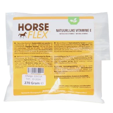 Let op, dit is een zak in plaats van een potje. HorseFlex Natuurlijke Vitamine E is een voedermiddel voor paarden ter ondersteuning van de spieren, spierstofwisseling en vruchtbaarheid. Het bevat de hoogste kwaliteit natuurlijke vitamine E (RRR-alpha-tocoferol) met MSM, zonder toevoeging van selenium.