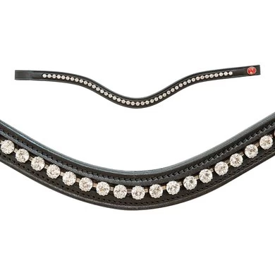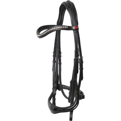 Het Kieffer Ultrasoft® Amy Double Bridle voorzien van een aansnoerneusriem houdt in de eerste plaats rekening met het hoogste comfortniveau voor het gevoelige paardenhoofd met al zijn aangezichtszenuwen en bloedvaten. Het succesvol toegepaste concept van anatomische Kieffer Trenshoofdstellen is nu ook verkrijgbaar als exclusief dubbelhoofdstelmodel. Het anatomisch gevormde kroonstuk ‘Comfort’ met zijn boterzachte contactoppervlak en de uitsnijding bij het oor zorgt voor een zachte drukverdeling op de nek. De eveneens zacht onderlegde, anatomisch gevormde neusriem met zijn afgeronde snit past perfect op het paardenhoofd en laat de gevoelige zenuwen effectief buiten beschouwing. De elegant gebogen lakneusriem en de met witte kristallen versierde frontriem zorgen voor een WOW-effect in de dressuurarena.