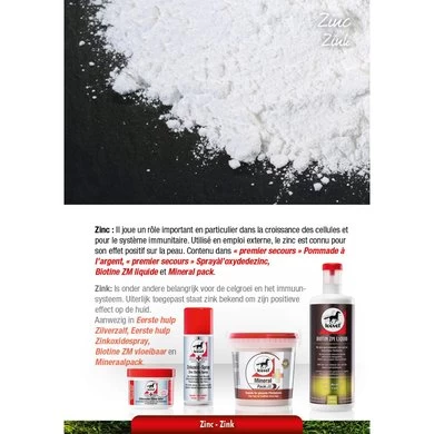 Leovet vloeibare Biotine ZM zorgt voor een gezonde hoefgroei en verbeterde hoornkwaliteit. Door de toevoeging van Zink (Z) wordt de groei en ontwikkeling van de hoef bevorderd. Methionine (M) is een bouwsteen van haar en hoorn. De groei van de hoef wordt bevorderd maar ook de kwaliteit van de hoef wordt verbeterd. Dor de vloeibare vorm kan de Biotine niet van het voer afgeblazen worden en is de opname beter. Verder kan een vloeibaar product beter gedoseerd worden. Gemiddelde dosis: 20 ml per dag.