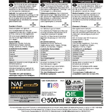 We hebben allemaal een beetje hulp nodig om te herstellen na een inspannende oefening. Het is belangrijk om alle vitale voedingsstoffen aan te vullen die tijdens de training verloren zijn gegaan. NAF heeft RECOVER ontwikkeld met een krachtige, natuurlijke antioxidantformule, bedoeld om het herstel van de spieren van het paard, na harde arbeid, te versnellen. Ideaal na competitie of opeenvolgende periodes van intense of inspannende oefeningen. Recover helpt bij het natuurlijke herstelproces van het paard en ontspant de spieren. Op deze wijze draagt het bij aan de mobiliteit. Het enthousiasme en het atletische potentieel van het paard blijven gehandhaafd. Voer het 5 dagen achtereen en u zult merken dat uw paard in topconditie blijft en klaar is voor de volgende uitdaging.
