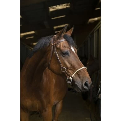Side-pull van buffelleer. Koord neusriem. Witte stiksels. Roestvrijstalen gesp. Verkocht zonder teugels.