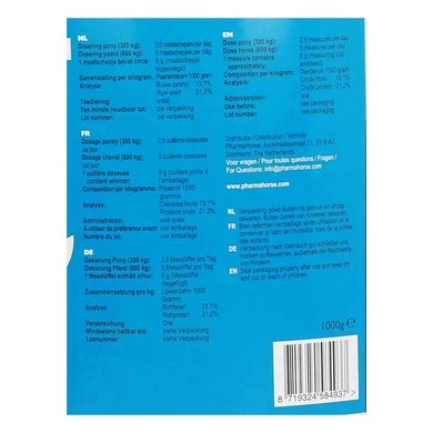 Dit product is een voedermiddel voor paarden. PharmaHorse maakt gebruik van ingrediënten van Human Grade Kwaliteit, waardoor een hoge kwaliteit is gewaarborgd. Desondanks is dit product door de etikettering, de grootte van het maatschepje en de geadviseerde dosering uitsluitend bedoeld voor gebruik bij pony’s en paarden.
