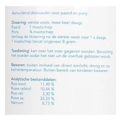 Kan over het voer gegeven worden. Bevochtig het poeder, zodat het niet uit de voerbak geblazen wordt.