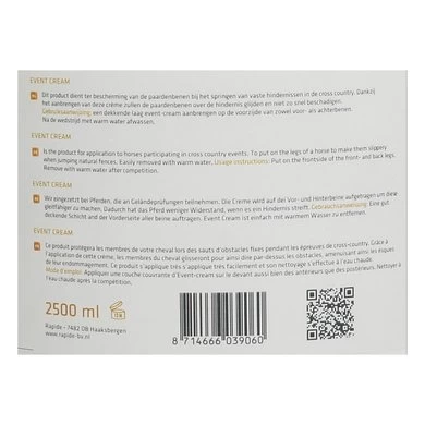 Een dekkende laag event-cream aanbrengen op de voorzijde van zowel voor- als achterbenen. Na de wedstrijd met warm water afwassen.