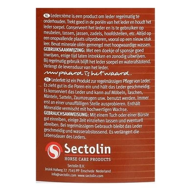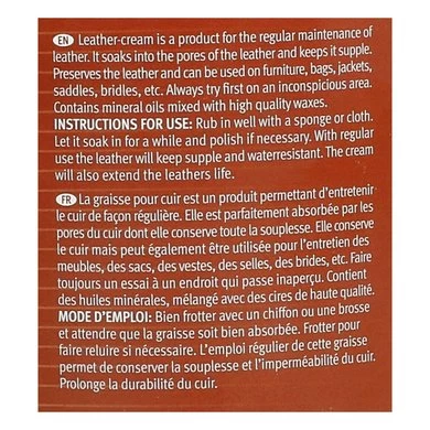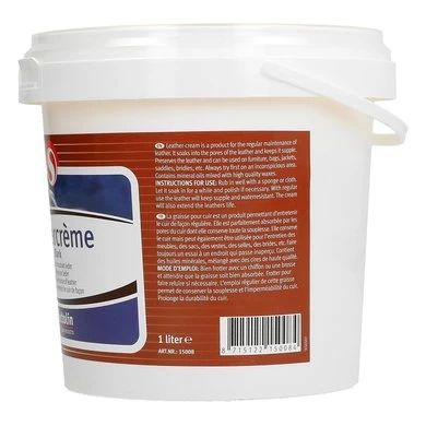 Ledercrème is een product om leder regelmatig te onderhouden. Trekt goed in de poriën van het leder en houdt het leder soepel. Ledercrème onderhoudt het leder en heeft als eigenschap dat het snel in het leder trekt en het weer soepel, zacht en waterafstotend maakt. Conserveert het leder en is te gebruiken op meubelen, tassen, jassen, zadels, hoofdstellen, etc. Altijd op een onopvallende plaats uitproberen, vooral op een nieuw stuk leer. Bevat minerale oliën gemengd met hoogwaardige wassen.