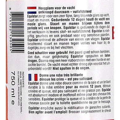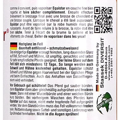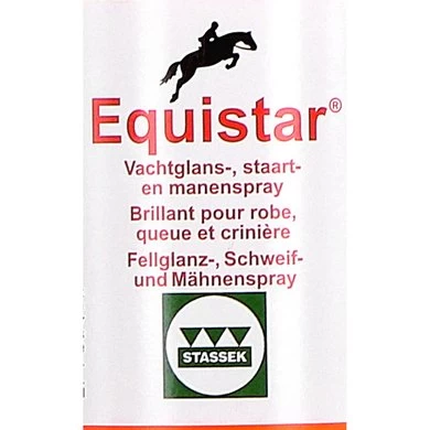 Equistar van Stassek is het anti klitmiddel dat zorgt voor een mooie lang blijvende glans op vacht, staart en manen. Manen en staart blijven tot wel 12 dagen goed doorkambaar. Heeft een stof- en en vuilafwerende werking. Wordt afgeleverd zonder vernevelaar/ sproeikop.