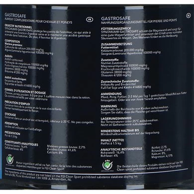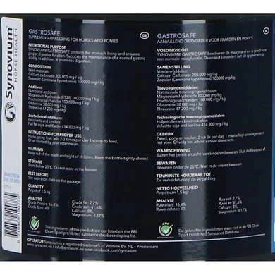 Synovium Gastrosafe is een voedingssupplement voor paarden met een gevoelige maag en is ontwikkeld voor een goede maagfunctie. Gastrosafe beschermt de maagwand en heet een maagversterkende invloed. Dit product kan dagelijks gegeven worden en kan preventief gebruikt worden. Te gebruiken bij paarden met een overgevoelige maag.