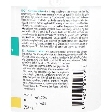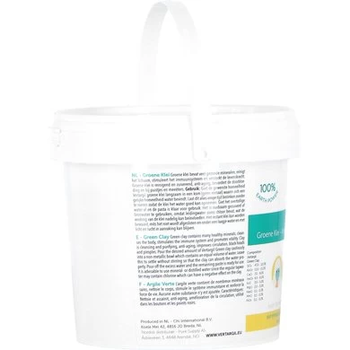 Giet de gewenste hoeveelheid Vertargil – Groene Leem langzaam in een niet metalen kom of bakje waarin zich een gelijke hoeveelheid water bevindt. Laat dit alles enige tijd bezinken zonder te roeren opdat de leem het wter goed kan opnemen. Giet het overtollige water af e4n de pasta is klaar voor gebruik.