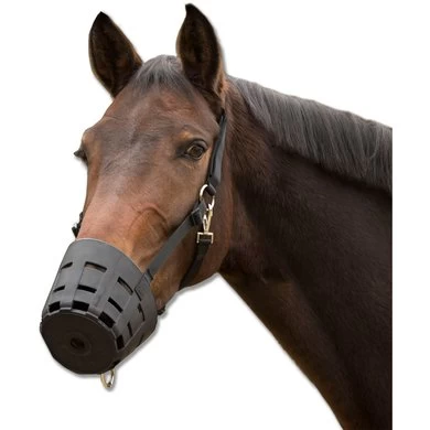 De TPU-muilkorf is een robuuste en onderhoudsvriendelijke muilkorf om de voedselopname, met name tijdens het grazen, te verminderen. Halster met geïntegreerde veilige sluiting op het kopstuk.