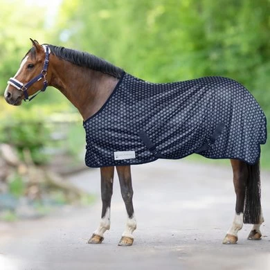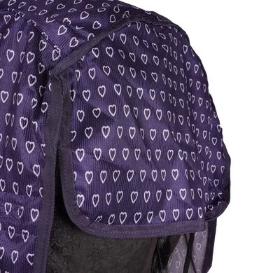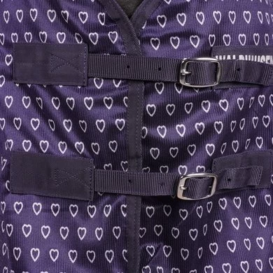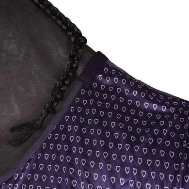 Lichtgewicht vliegendeken met hartjesprint, dubbele sluiting aan de voorkant, gekruiste banden met elastiek en filetkoord. Komt overeen met alle artikelen in de Waldhausen Lucky Heart-serie.
